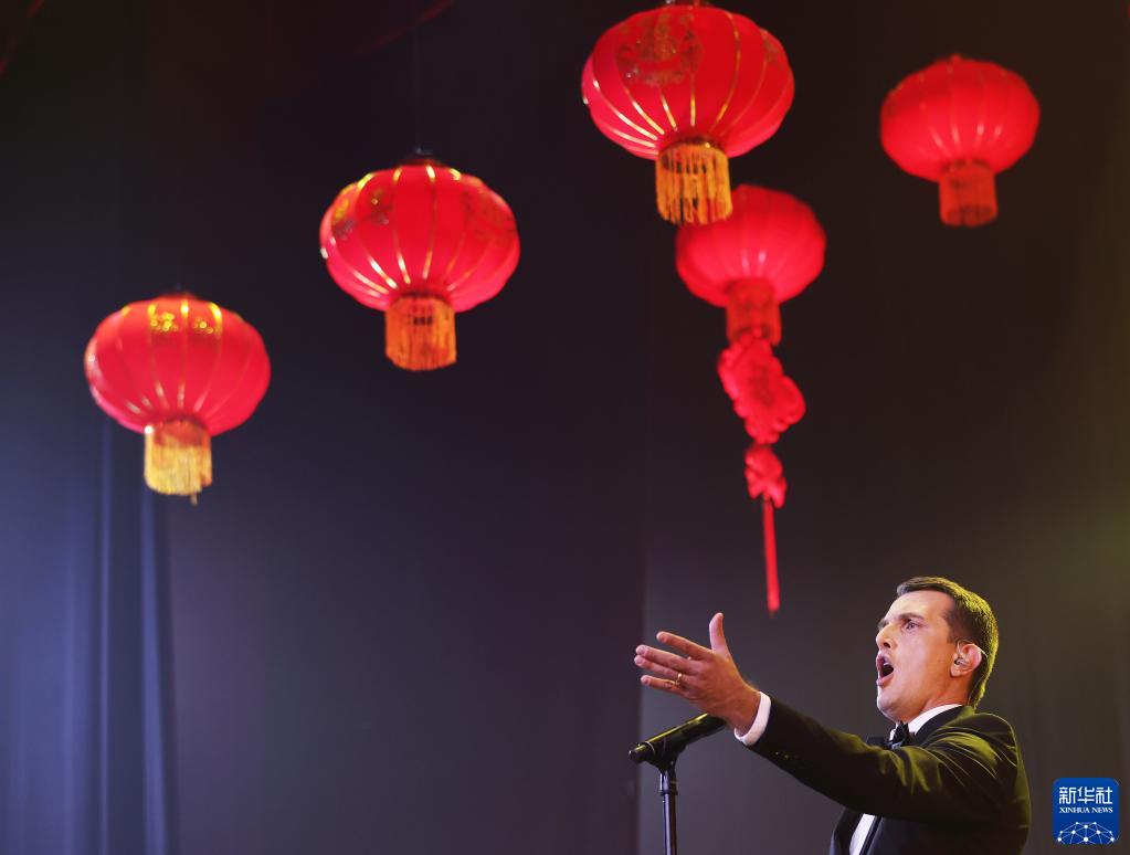 1月26日,在法国巴黎,巴黎歌剧院意大利男高音歌唱家吕卡·萨纳伊在“和平·友谊·爱”冬奥新春音乐会录制现场演唱《我的太阳》。