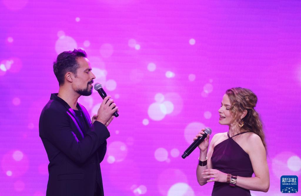 1月26日,在法国巴黎,法国歌手塞西莉亚·卡拉(右)和达米安·萨格在“和平·友谊·爱”冬奥新春音乐会录制现场演唱音乐剧《罗密欧与朱丽叶》的主题曲《爱》。