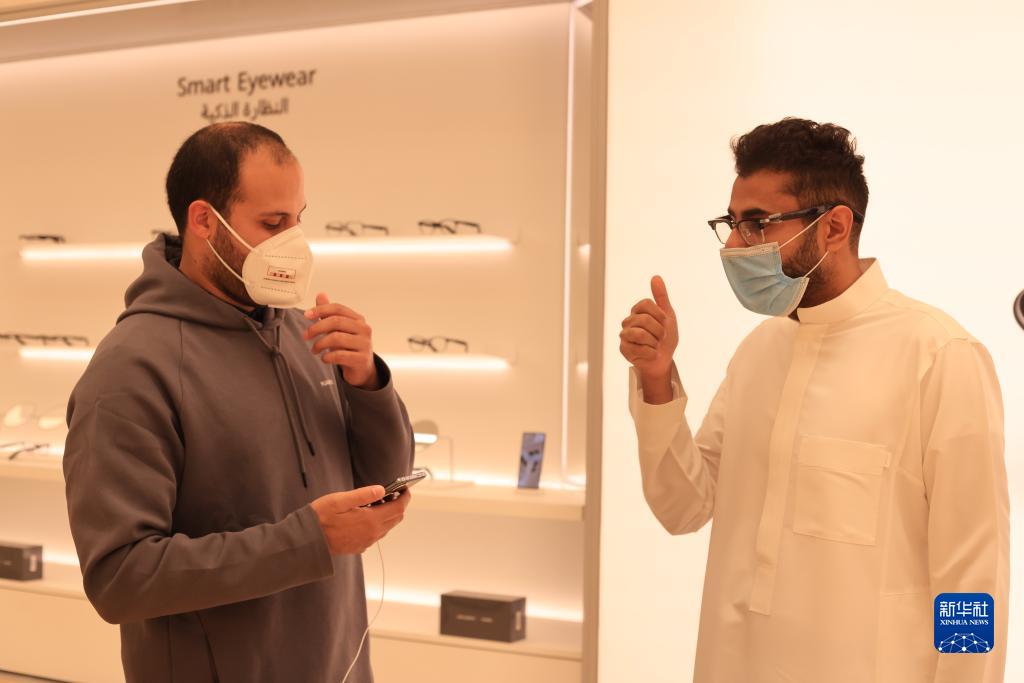 2月2日,在沙特首都利雅得,顾客在华为旗舰店内体验华为智能眼镜。