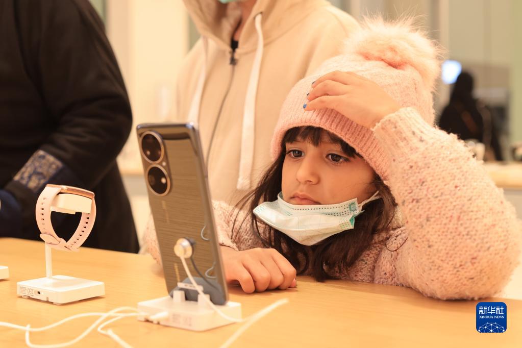 2月2日,在沙特首都利雅得,顾客在华为旗舰店内体验华为智能手机。