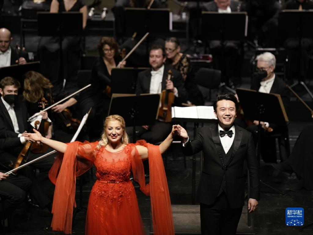 2月6日,在奥地利萨尔茨堡,中国男高音歌唱家张龙(前右)与奥地利女高音歌唱家维多利亚·瓦尔加一起向观众致意。