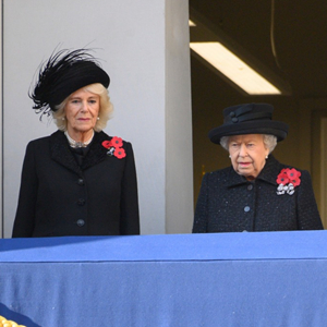 2019年11月10日,在英国伦敦,英国女王伊丽莎白二世(中)、英国王储查尔斯的夫人卡米拉(左)与凯特王妃出席国家停战纪念日活动。(新华社发,雷伊·唐摄)