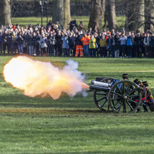 2月7日,英国士兵在伦敦白金汉宫旁的格林公园鸣放礼炮,庆祝女王伊丽莎白二世登基70周年。