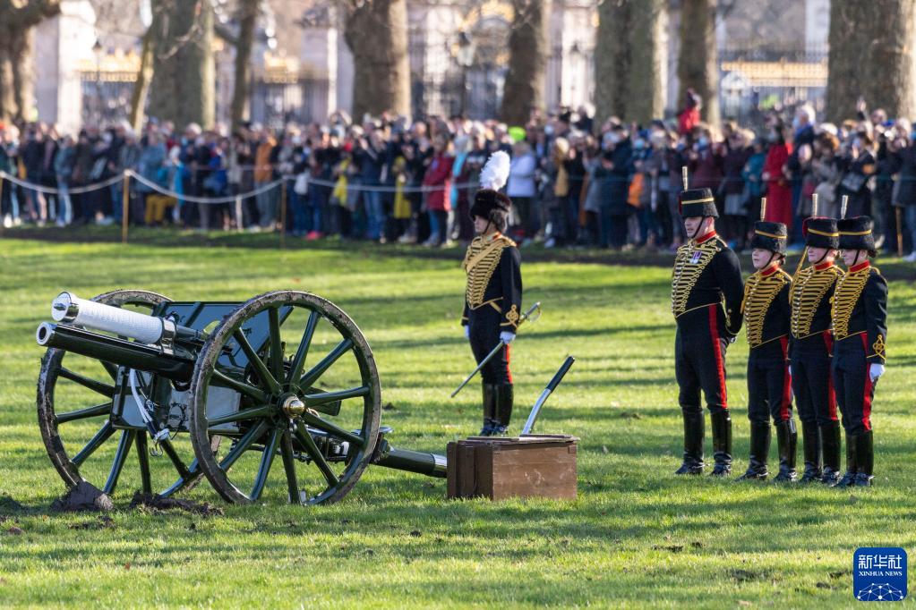 2月7日,英国士兵在伦敦白金汉宫旁的格林公园鸣放礼炮,庆祝女王伊丽莎白二世登基70周年。