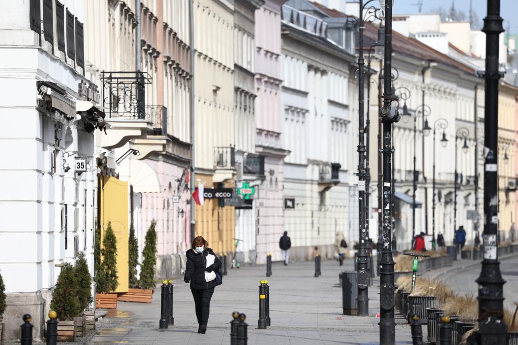 2021年3月20日,在波兰首都华沙市中心,行人走在空旷的大街上。新华社发(亚普·阿林摄)