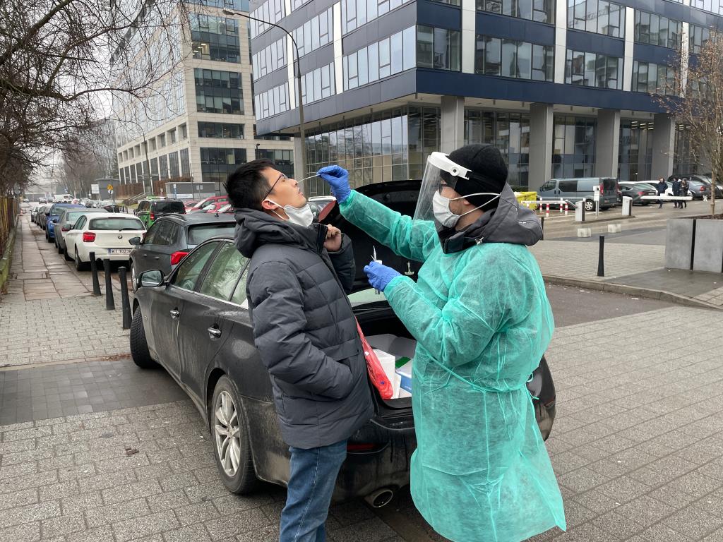 2022年1月26日,在波兰首都华沙,医生马切伊·里加尔斯基在为被检测人员进行核酸采样。新华社记者陈琛摄