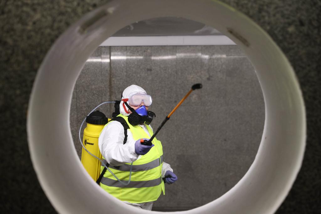 2021年4月10日,工作人员在波兰华沙为公共场所消毒。新华社发
