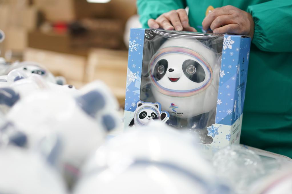 2月8日,工人在特许生产商的车间里包装“冰墩墩”。(新华社记者 季春鹏 摄)