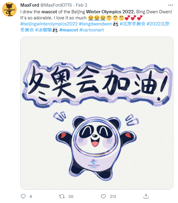 译文:我画了一个2022年北京冬奥会的吉祥物冰墩墩,它太可爱了,我太喜欢它了!