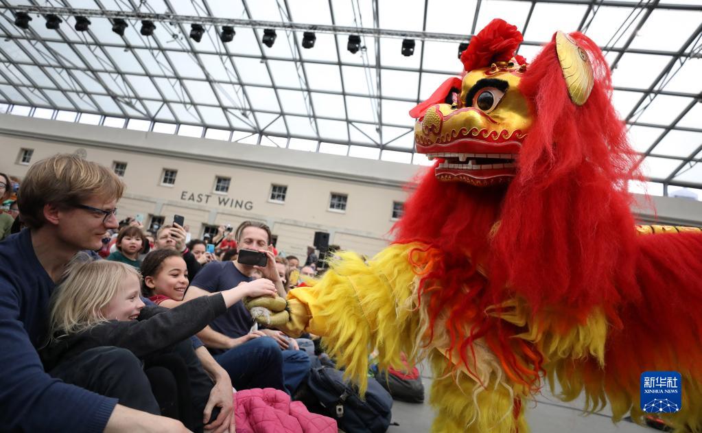 1月29日,人们在位于伦敦的英国国家海事博物馆与正在表演的“狮子”互动。