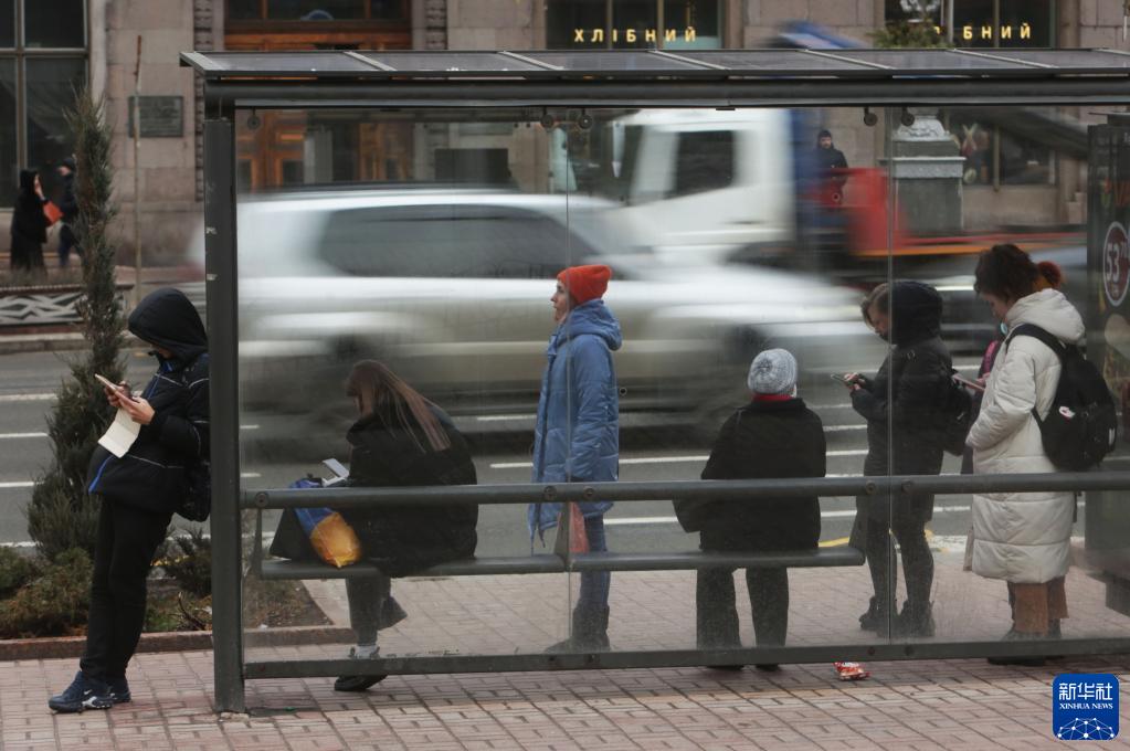 2月10日,市民在乌克兰基辅一处公交站等车。