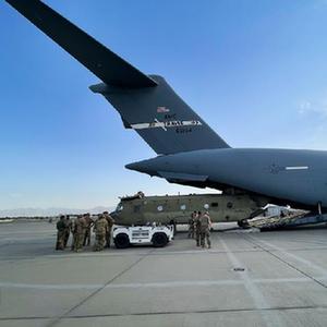 美国中央司令部司令肯尼思·麦肯齐2021年8月30日宣布,美军已完成从阿富汗撤出的任务。这是当年8月28日一架CH-47运输直升机在阿富汗喀布尔国际机场被装载到C-17运输机上。(新华社发)