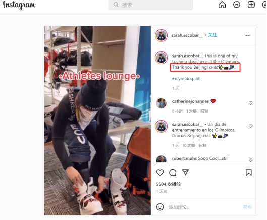 她对自己的训练非常满意,特意在海外社交媒体用英语和西班牙语双语发文称:“这是我在冬奥村里日常训练的一天。谢谢你,北京!”