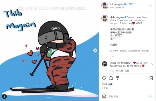 西班牙滑雪运动员蒂博·马格宁用双语感谢中国。(图片来源:Instagram)