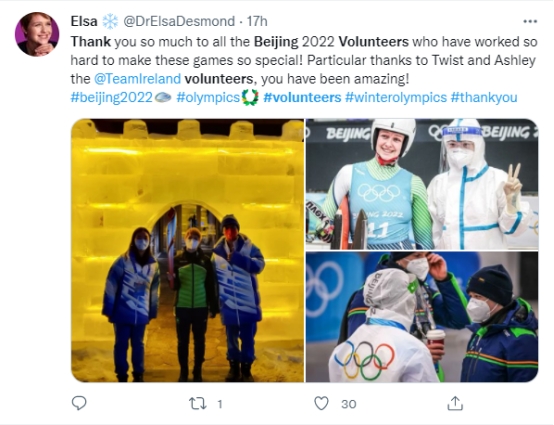 格鲁吉亚高山滑雪运动员妮诺·齐克劳里说“中国志愿者非常热情,把自己的快乐传递给所有运动员”;日本《Daily》记者称志愿者“全都是亲切的工作人员,厚重防护服下是一双双含笑的眼睛”。爱尔兰雪橇运动员埃尔莎·德斯蒙德在自己的社交媒体账号发文感谢志愿者们的热情帮助。