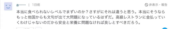 “真的难吃到没法吃的地步吗?我想应该不会到那种地步吧。如果真是那样那别的国家也会有人批评。这不是高级餐厅,在安全和营养方面没问题就行。”