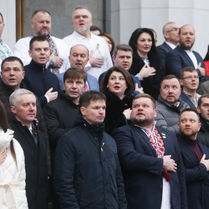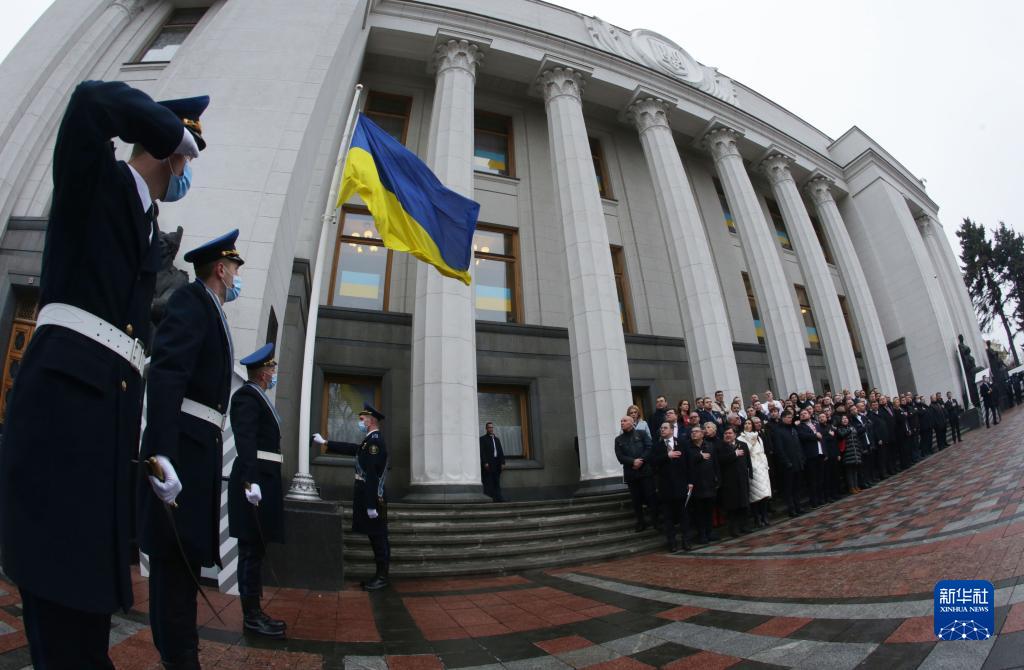 2月16日,在乌克兰首都基辅,议员们在最高拉达(议会)门前的宪法广场参加团结日庆祝活动。