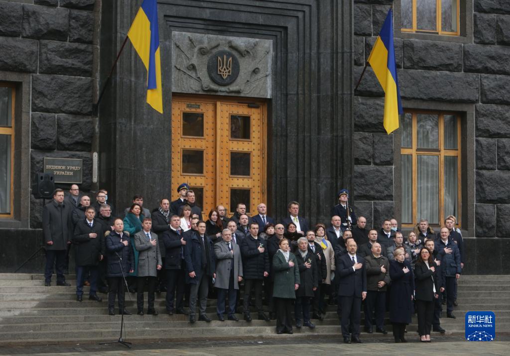 2月16日,在乌克兰首都基辅,乌克兰内阁成员在乌政府办公大楼前参加团结日庆祝活动。