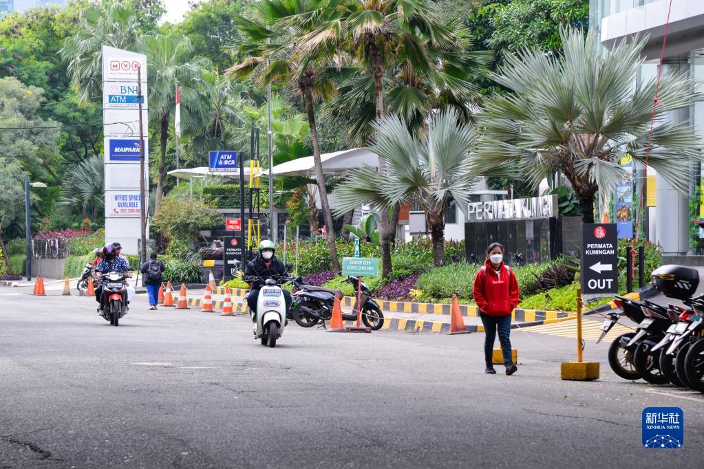 2月17日,人们佩戴口罩经过印度尼西亚首都雅加达的一栋写字楼前。新华社记者 徐钦 摄