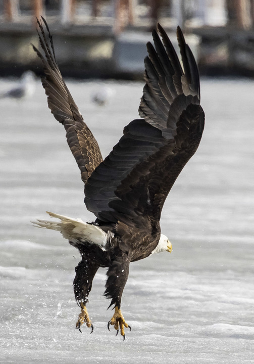 图为2021年3月8日,一只白头海雕在美国伊利诺伊州罗克艾兰的密西西比河捕食。(新华社发,乔尔·莱纳摄)
