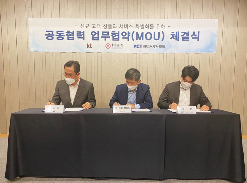 (左起)韩国电信集团常务元成昀、中国银行首尔分行副行长杜宝明、韩中人才开发院理事康震签署合作备忘录。(韩中人才开发院供图)