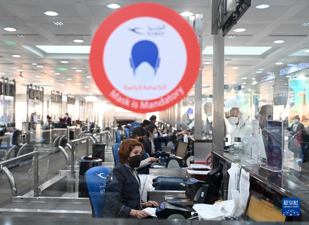2月20日,在科威特费尔瓦尼耶省的科威特国际机场出发大厅,工作人员为旅客办理登机手续。