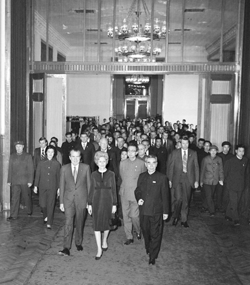 1972年2月21日,周恩来总理举行宴会,欢迎美国总统尼克松和夫人。这是宾主步入宴会厅。新华社发(资料照片)