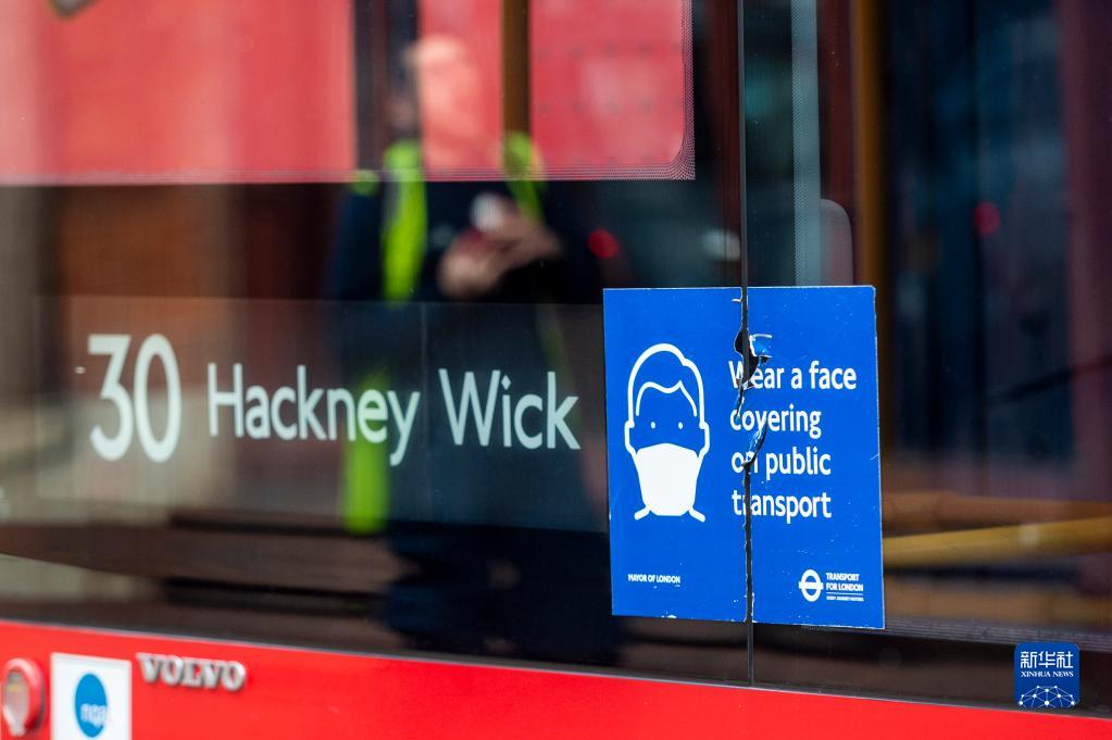 这是2月21日在英国伦敦拍摄的一辆公共汽车上破裂的佩戴口罩告示。