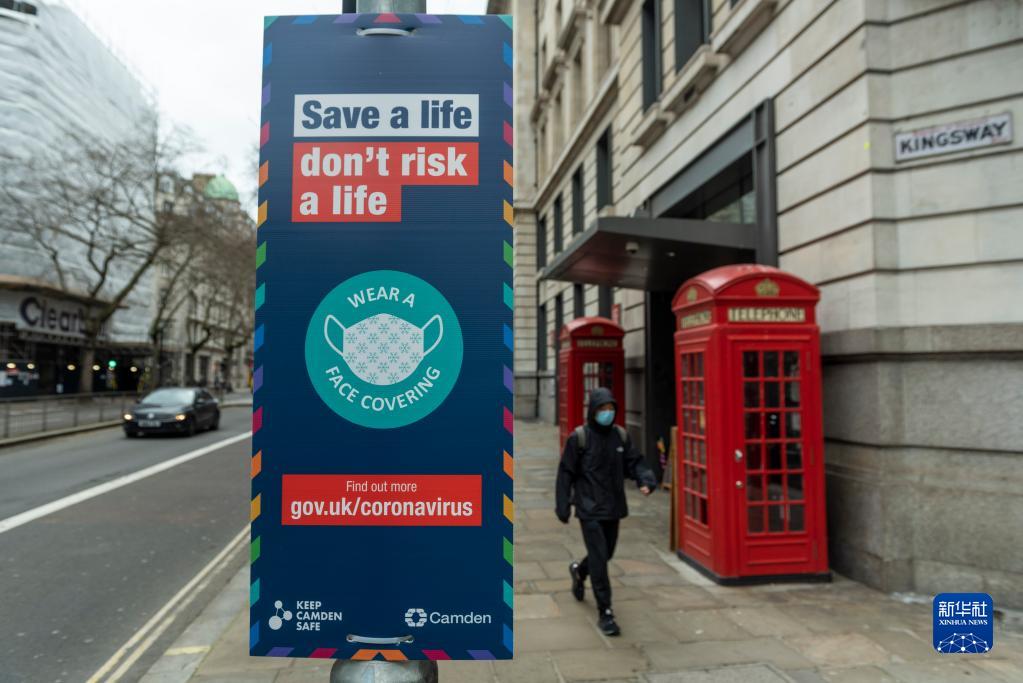 2月21日,在英国伦敦,一名男子经过街头鼓励人们戴口罩的告示。