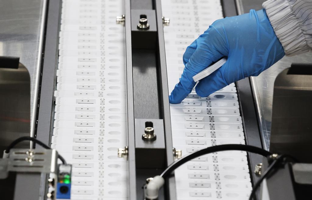 这是2月23日在韩国京畿道拍摄的新冠病毒快速检测设备生产线。新华社/纽西斯通讯社