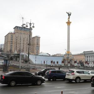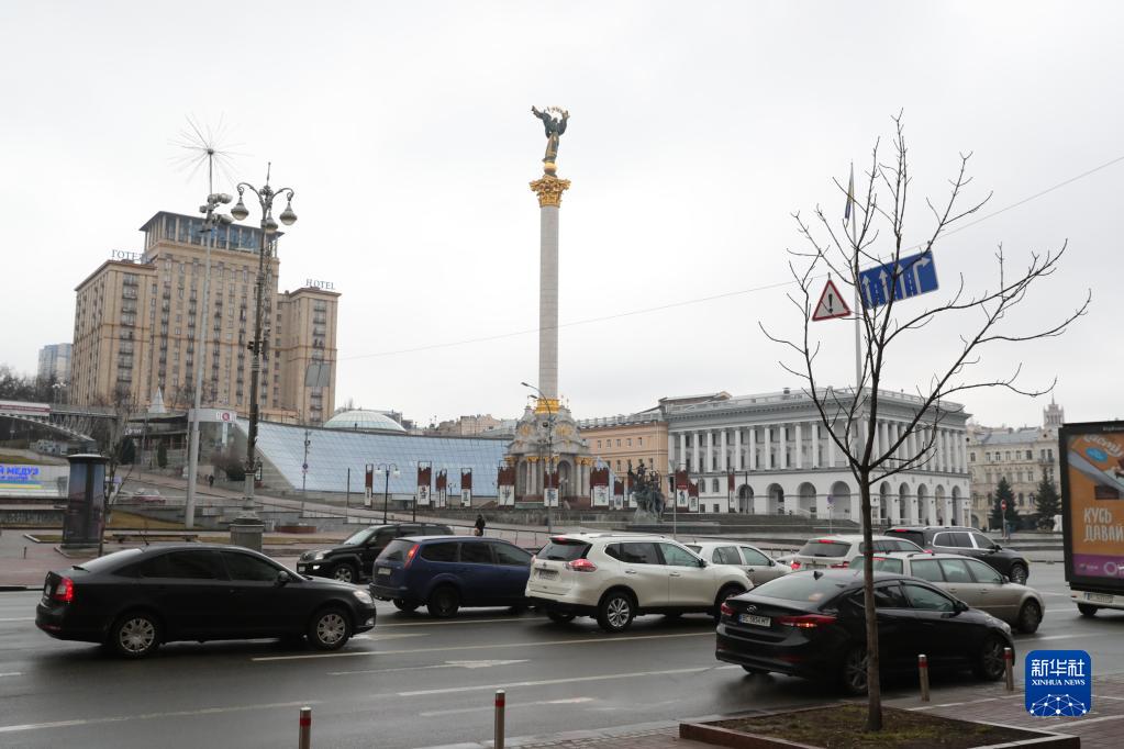 2月24日,车辆从乌克兰基辅独立广场旁驶过。新华社记者 李东旭 摄
