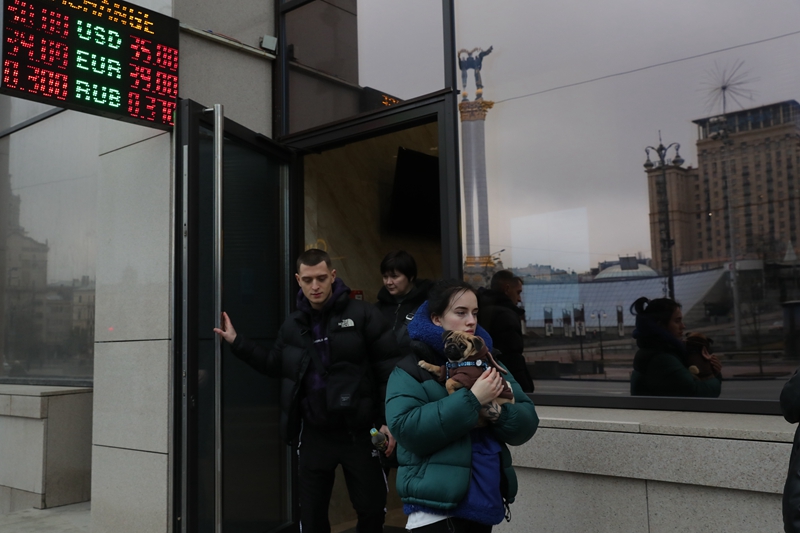 ↑2月24日,在乌克兰基辅,当地居民从一处换汇点离开。