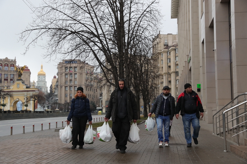↑2月24日,在乌克兰基辅,当地居民拎着采购的物资走在街道上。
