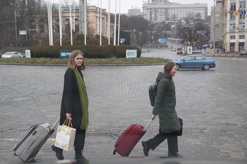 ↑2月24日,两名女子拉着行李箱走过乌克兰基辅的欧洲广场。
