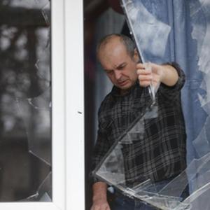 2月24日,顿涅茨克当地居民查看受损的房屋。新华社发