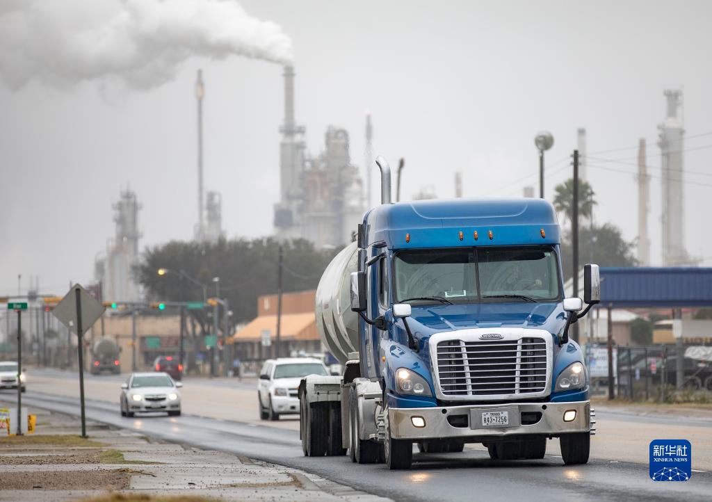 2月24日,在美国得克萨斯州三河市,一辆油罐车行驶在道路上。