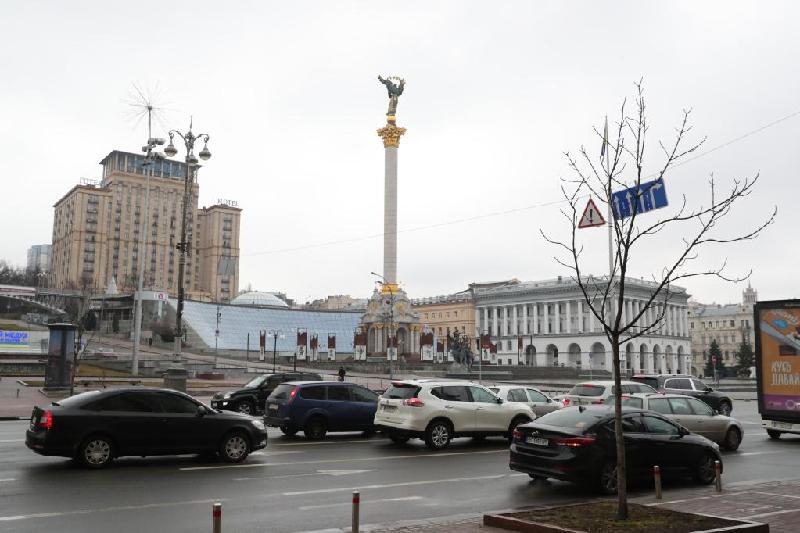 2月24日,车辆从乌克兰基辅独立广场旁驶过。新华社记者李东旭摄