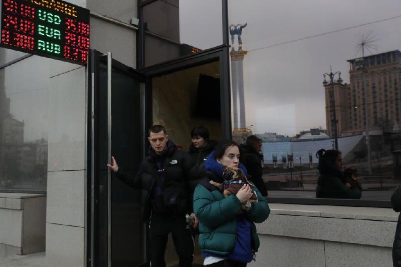 2月24日,在乌克兰基辅,当地居民从一处换汇点离开。新华社记者李东旭摄
