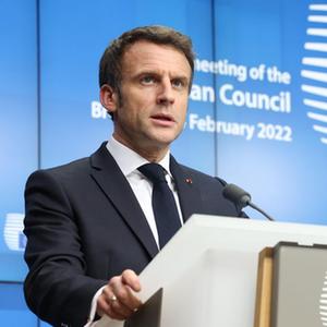 2月25日,在比利时布鲁塞尔,法国总统马克龙在欧盟特别峰会后的新闻发布会上发言。