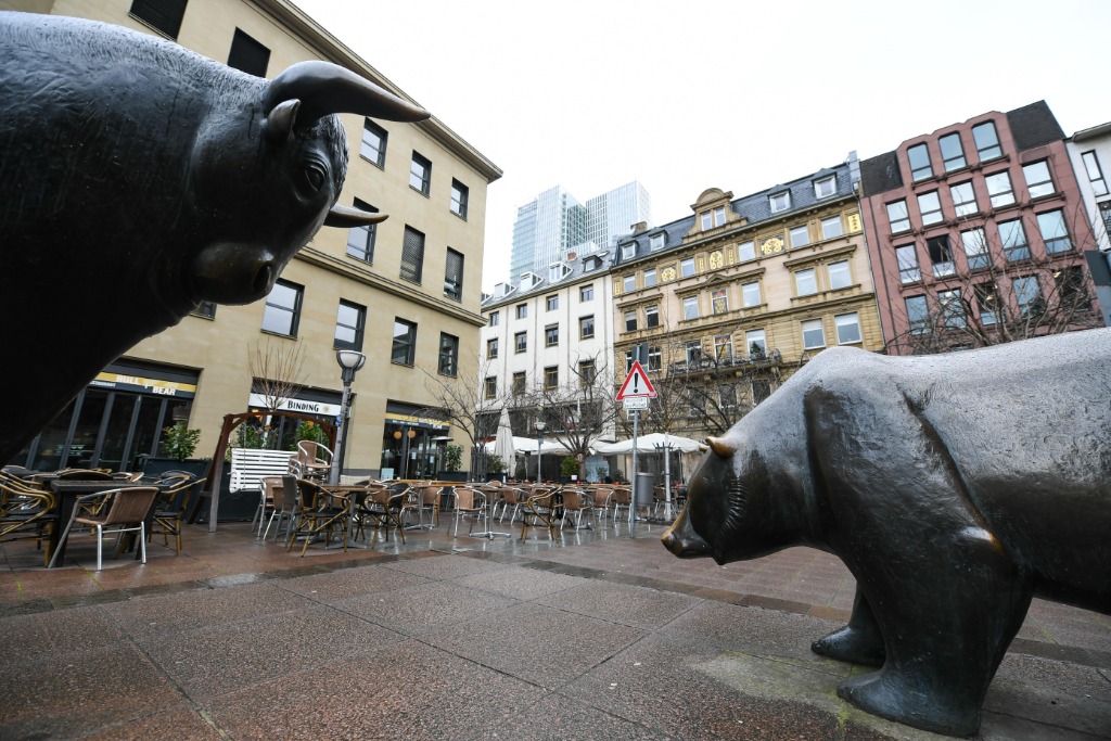 这是2月24日在德国法兰克福证券交易所外拍摄的“熊牛对峙”雕塑。(新华社记者逯阳摄)