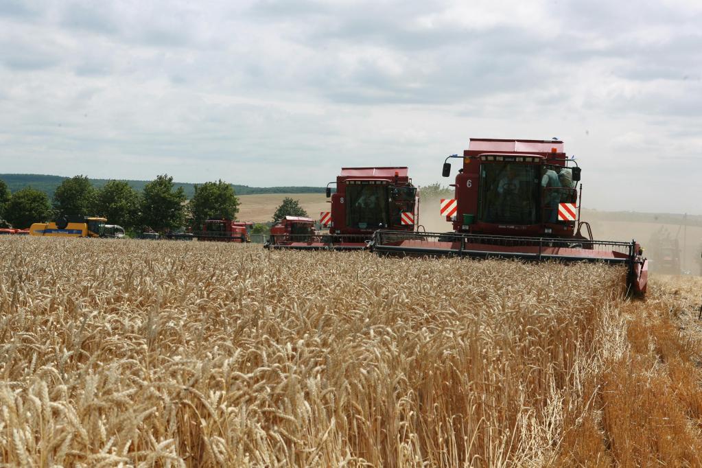 这是2008年7月17日,在乌克兰西南部的文尼察州拍摄的大型联合收割机收割小麦。(新华社发)