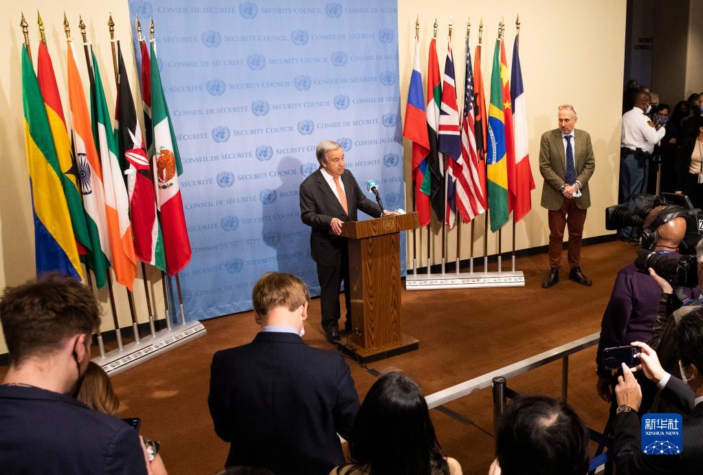 2月25日,在位于纽约的联合国总部,联合国秘书长古特雷斯参加新闻发布会。