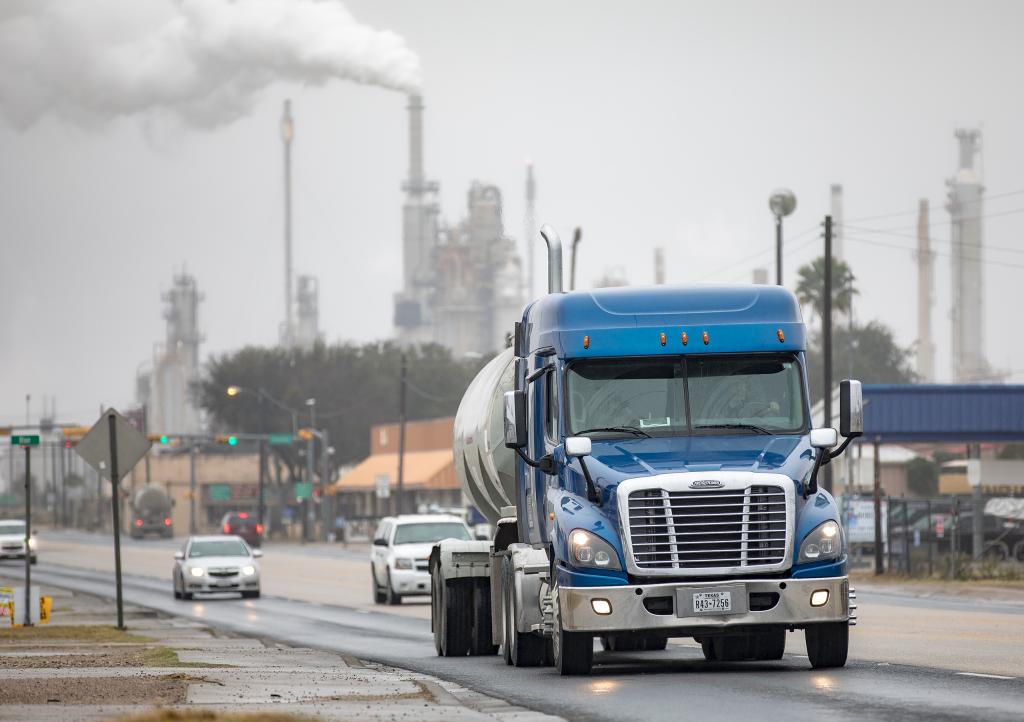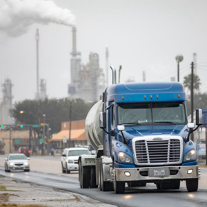2月24日,在美国得克萨斯州三河市,一辆油罐车行驶在道路上。(新华社发,尼克·瓦格纳摄)
