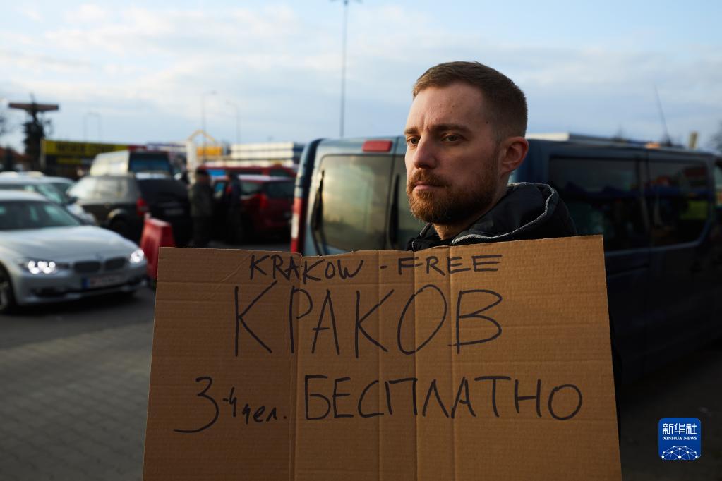 2月26日,在波兰普热梅西尔,一名男子举着牌子,写上将要去往的目的地,表示可免费载人前往。新华社记者 孟鼎博 摄