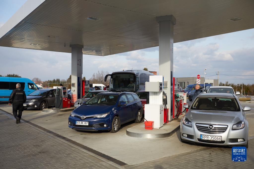 2月26日,在波兰靠近乌克兰边境的一处加油站,车辆排队加油。新华社记者 孟鼎博 摄