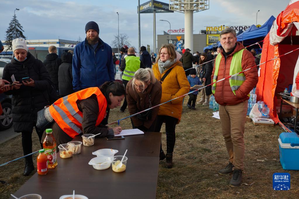 新华社记者26日驱车从华沙赶往波乌边境,看到普热梅西尔市中心通往边境的主干道旁,一个大型购物区的停车场上临时搭建起十多顶蓝色大帐篷。帐篷里面,来自波兰各地的志愿者不断向到来的乌克兰人提供各种生活必需品,包括饼干、方便面、矿泉水、厕纸和婴儿纸尿布等,还有各种紧急筹集来的衣物。