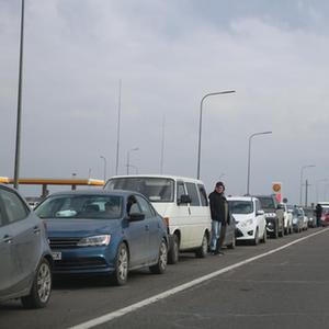 2月27日,在乌克兰克拉科韦茨,车辆排队等待前往波兰方向。