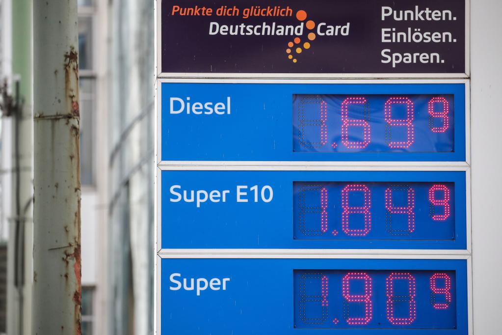 这是2月25日在德国法兰克福拍摄的一家加油站屏幕上显示的油品价格。(新华社发,阿曼多·巴巴尼摄)