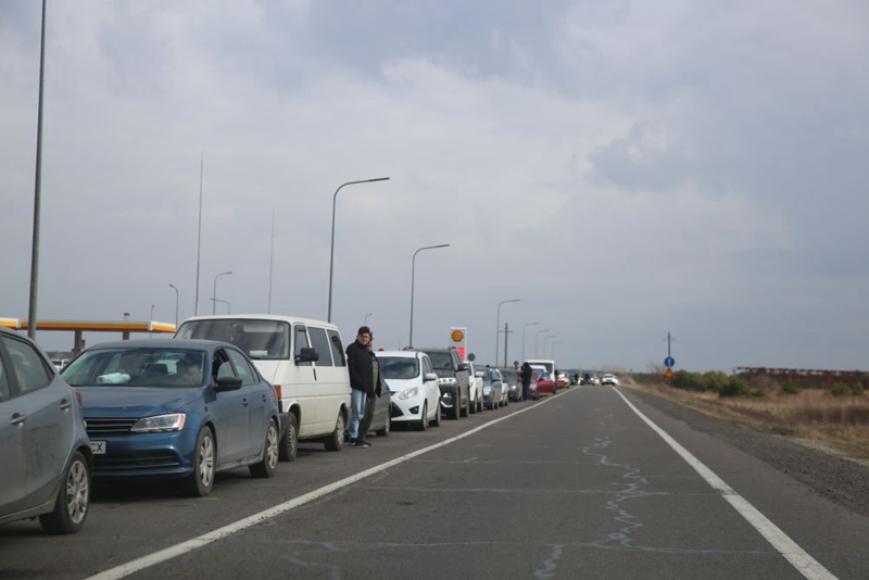↑2月27日,在乌克兰克拉科韦茨,车辆排队等待前往波兰方向。新华社记者 陈文仙 摄