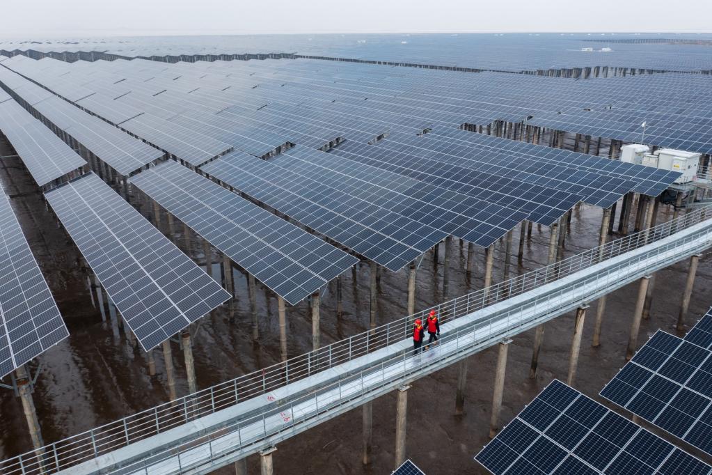 图为2021年12月29日拍摄的浙江省宁波市象山县长大涂滩涂光伏项目(无人机照片)。(新华社记者徐昱摄)